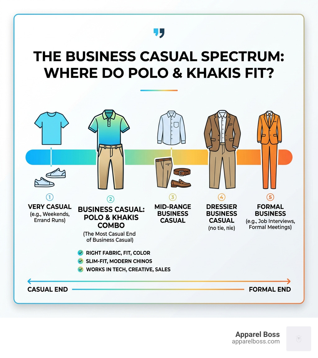 Business casual polo and khakis is one of the most common workplace outfit combinations — but it's also one of the most misunderstood.